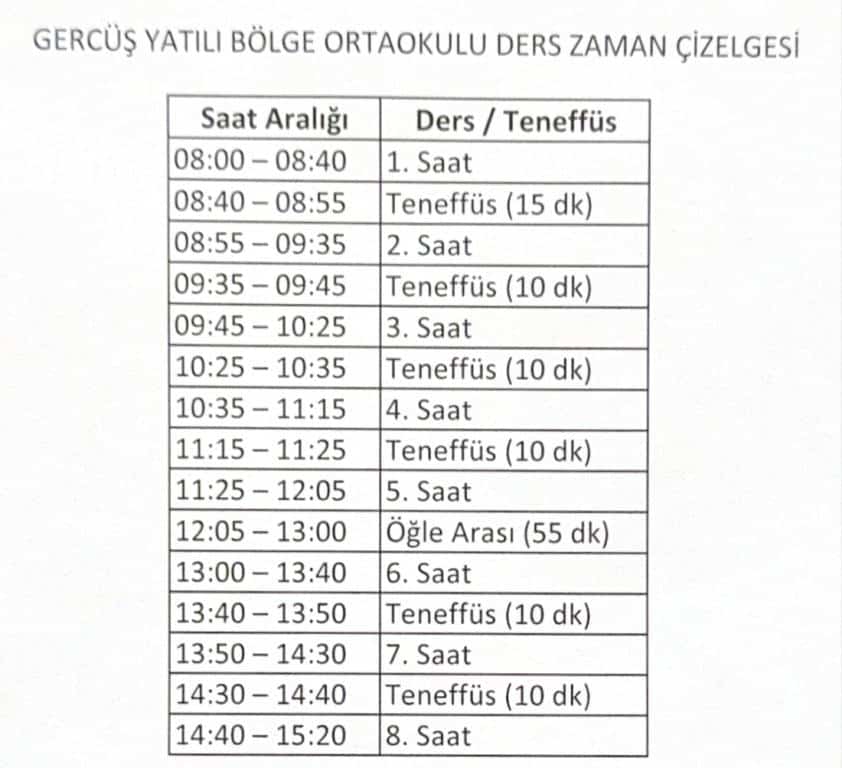 OKULUMUZ DERS ZAMAN ÇİZELGESİ
